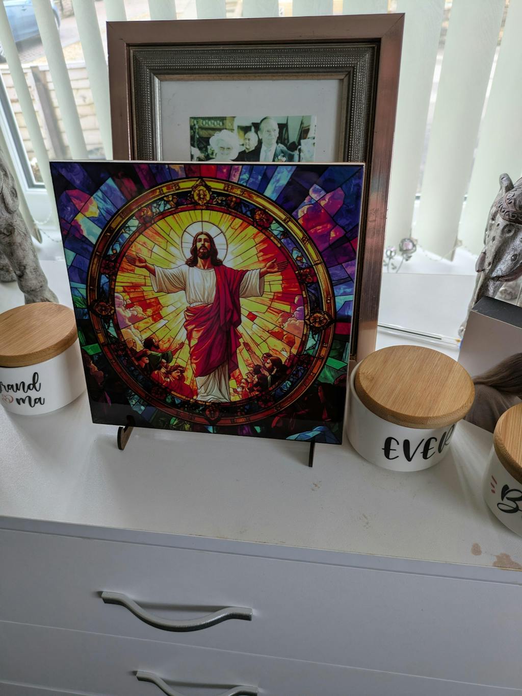 Decorative trivet with stained glass design of a religious figure on a table.